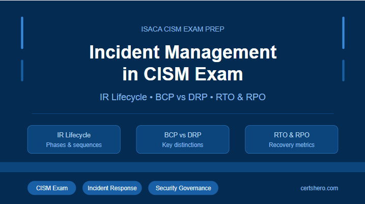 Incident management on the CISM is tested at the management level, not the technical level. The IR lifecycle matters because the sequence has governance implications. BCP and DRP matter because confusing them leads to incomplete planning. RTO and RPO matter because they connect technical decisions to business risk.